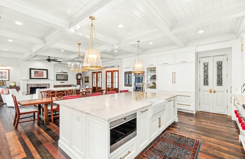 The expansive kitchen is a dream come true for culinary adventurers, providing ample space to whip up delectable meals with your vacation companions. Equipped with top-of-the-line stainless steel appliances, a spacious island, and roomy countertop seating for five, it's a hub for entertainment. The dining area offers plenty of seating and is the ideal place to share a meal after a day of adventure.