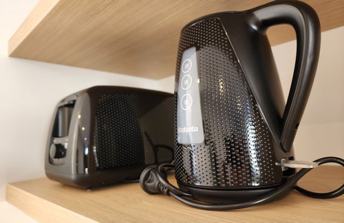 While you're here, you can enjoy all the comforts of home and more, including a refrigerator and an oven, as well as a stovetop and a dishwasher. Other amenities include towels, an electric kettle, kitchenware and utensils, and a toaster.