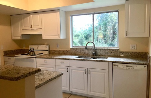 Kitchen has beautiful granite countertops and is newly updated. For the cooks out there ,there is everything needed to show your cooking skills: pots, pans , dishes, cups,glasses ,utensils and spices .