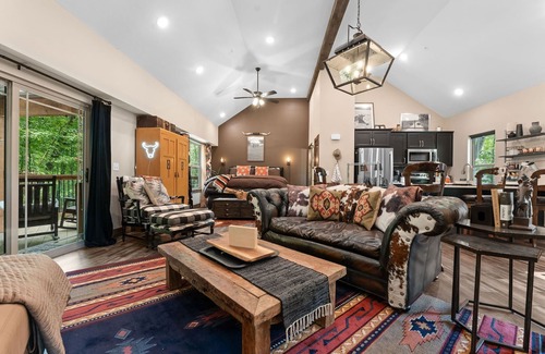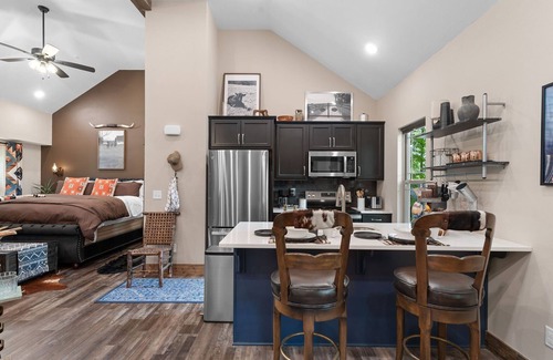 Welcome to Horn Ridge, your private escape nestled in a beautifully landscaped corner of Tall Timbers Camp Resort. This luxurious one-bedroom studio cabin is the perfect setting for a honeymoon, anniversary, or cozy couple's getaway. With serene views of the Ozarks, a heart-shaped hot tub, and a stunning firepit seating area under the stars, this is where romance and relaxation meet. Pet-friendly — up to 2 small dogs (35 lbs or less each) may be accepted with prior approval (fee applies).