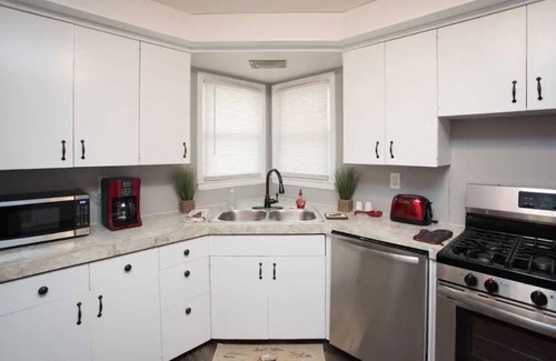 This house has 5 bedrooms, 6 beds, and 2 full bathrooms in total, with 3 bedrooms and one full bathroom upstairs, as well as 2 bedrooms and one full bathroom in the finished basement. It features a beautiful open kitchen with all stainless steel appliances. There is also a living room in the basement with a reading/computer desk, couches, and two smart TVs w/ RoKu (Netflix, Hulu, etc). The backyard has a full fence around it. There is a laundry room w/ a washer and dryer available. It is ideal for large groups.