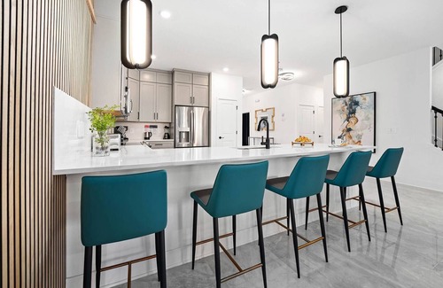 Whether you’re whipping up or warming up your vacay meals, this masterful Kitchen will help you handle it all with ease. The cabinets and drawers are fully stocked with tableware and cookware. The gadgets and appliances allow for all kinds of cooking (or reheating). And the large black island–which doubles as a breakfast counter with 5 comfy stools–offers a ton of space to prep or lay out a spread.
