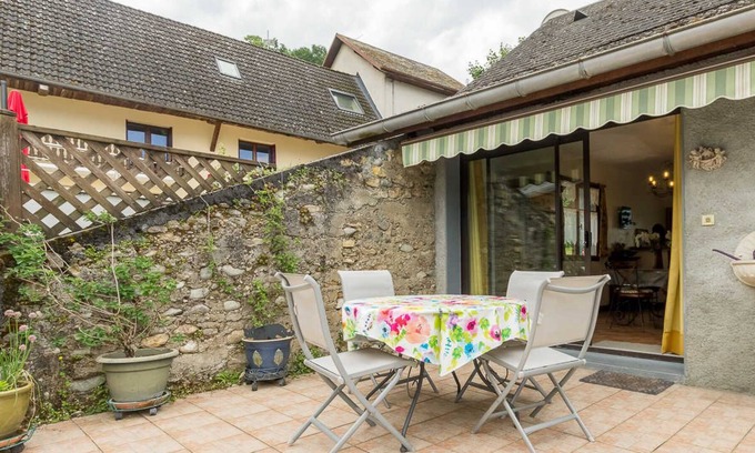 Apartment on the 1st floor of the owner's house (independent access by an exterior stone staircase of 20 steps from the courtyard). 20 m2 private terrace (view of the gymnasium and surrounding houses). Living room-living room-kitchen, 2 bedrooms (1 double bed 140x190 cm / 1 double bed 140x190 cm), bathroom (shower and wc), pantry. Private parking in the courtyard. Beautiful renovated country farm between lake and mountain, between Chambéry and Aix les Bains. Offering beautiful volumes and a neat decoration, its furnished terrace and the immediate proximity of the shops make it an ideal place to stay a few days, a week, the time of a spa treatment, to visit relatives or to discover the Savoyard foreland and the largest natural lake in France.