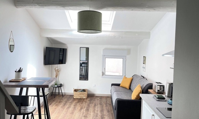 The space is cozy and well-designed, featuring a fully equipped kitchenette, a warm and inviting living area with a comfortable sofa bed, and a lovely mezzanine where you'll find the shower room and toilet, accessible via an elegant Japanese step staircase. The decor is modern, tasteful, and carefully chosen to create a relaxing and pleasant atmosphere.