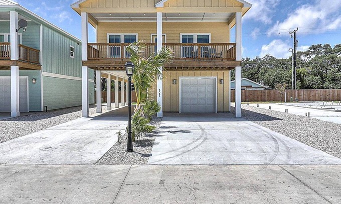 This 4 bedroom 3 bath home is beautiful and spacious with 1900 Square feet. When you walk into the front entryway you will find a large bedroom on the left with 2 Queen beds and a full bath. This is a great place for the kids to hangout. Upstairs there are three additional bedrooms and two bathrooms. The master has a king size bed an unsuite bath. Down the hall are the other two bedrooms that share a bath. One of the rooms has a king bed and the other two twins. There is a large patio out the side door and a small grassy area in the back of the house. There is a one car garage to put your beach and fishing gear. Upstairs are the Views, Views, Views! The open living room/ kitchen/ dining area has plenty room for everyone to spread out and enjoy themselves. The large balcony off the living area has a nice table and chairs to sit and watch the water with a coffee or a cocktail. This vacation home is brand new and in the middle of all the action. You can easily walk to 6 restaurants and the Irish Pub is right next door. Be one of the first people to stay in the long awaited Seven Palms Resort!
