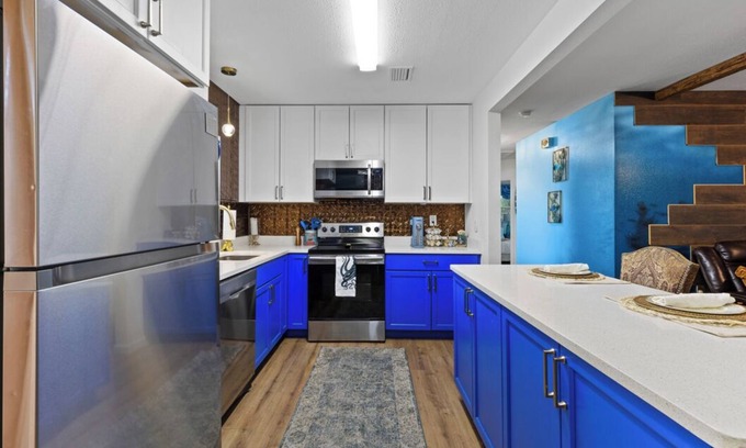 Ammenities Include: UV-reactive underwater game room with glowing features, High-speed Wi-Fi throughout the home, Comfortable “Captain’s Quarters” themed living room, 3 themed bedrooms with unique underwater stories, 2 full bathrooms, including an octopus-themed bath, Dining table for 8 with scuba diver wall art, Fully stocked kitchen with bronze deep-sea backdrop, Smart TVs for entertainment, Outdoor fire pit on a pebble “beach”, In-unit washer and dryer, Personal wall A/C unit in every room, Free parking on premises, Keyless self check-in, Makeup towels and mirrors for easy prep, Family-friendly setup with essentials, and a laptop-friendly workspace. Dive into a stay like no other—where every room tells a story and every detail is designed to transport you beneath the waves. You'll have full access to all spaces and amenities during your visit. If you have any questions or special requests, feel free to reach out—we’re always just a message away and happy to help make your underwater adventure unforgettable!