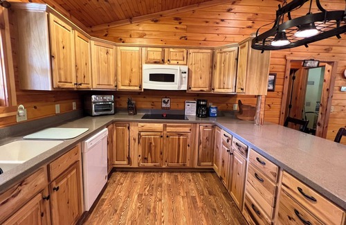 The cabin's main entry has a split bedroom open floor plan with with living room, kitchen, dining area, and both full size washer and dryer. The kitchen is fully stocked with all the necessary cooking utensils to cook a complete meal including cooktop, convection microwave/oven, 7-1 instapot, Duo coffee maker with regular coffee grounds and BBQ with a limited supply of spices. The living room is furnished with 2 leather couches and smart 55 inch TV. We offer Internet, and board games, puzzles and reading material for your enjoyment.