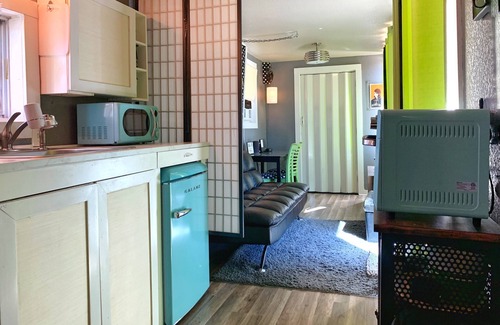 Outside, guests have a large furnished deck on top of the dwelling, a fire pit area, and the pool area. Guests can cook up some tasty treats on the provided propane grill. Places to stay in Texas don't come more unique than this beautiful 320 sqft home near Austin!
