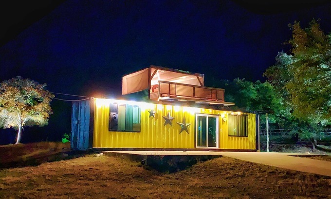 This one-of-a-kind container home, located in Leander at Old Stick Ranch, is perfect for up to five guests to enjoy time away near Austin, Texas. The dwelling has one cozy bedroom, a full bathroom and for the adventurous an outdoor bedroom. Linens and towels are kindly provided. TheContainer sits on 7 fenced in acres at the top of a mesa and is one square acre behind the main house at old stick ranch. The entire property backs up to 23,000 acres of Canyonland Preserve.