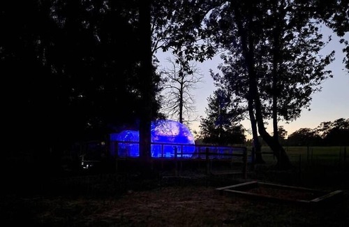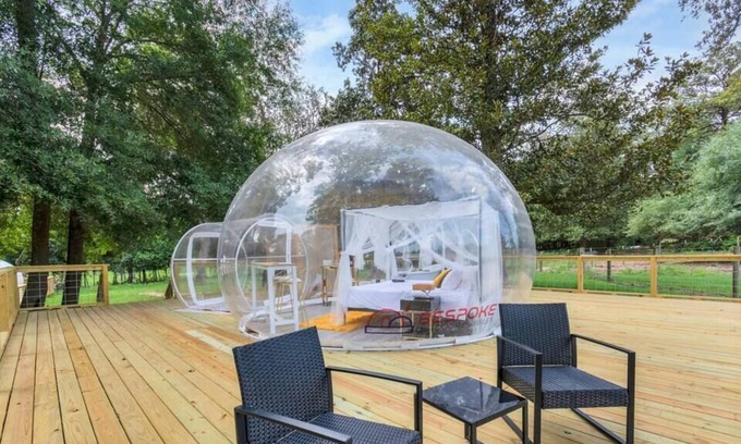 Are you looking for a unique place to spice up your trip? Have you ever slept in a bubble? Well come try it out! This is truly a once in a lifetime find. When you stay in one of our inflatable bubbles on the farm with an enormous pool, not only do you get to experience something new and exciting, you also have access to so many fun things to do! The coolest part? The top is transparent so you can fall asleep wishing on a star.This inflatable bubble is anchored to a sturdy wooden deck and inflated with an air blower.Inside you’ll find a cozy king bed that can comfortably sleep up to three guests (2 adults and 1 child).There is air conditioning and heating inside as well as a full private bathroom. The bathroom even has a clawfoot tub! Toiletries are provided for you during your stay. The bubble is located in Sam Houston National Forest on a beautiful ranchette of almost 8 acres. On the ranchette you’ll be able to see chickens, turkeys (seasonal), goats, pigs, rabbits and a garden near the home as well as livestock grazing in the pastures. Wildlife is present in the forest so there are some food restrictions inside the bubble to keep you safe. (See “rules to keep in mind”)A pathway that is clear during the day and perfectly lit for your convenience at night, takes you directly to a fully equipped outdoor kitchen. There, you will have access to a BBQ pit, an outdoor pavilion, pool, hot tub and pool house. If you’d like to have some fun, games like corn hole, oversized connect four, water volleyball and horseshoes for you to enjoy. If you’d like to relax, kick back in a hammock and take a nap in the fresh breeze.The fire pit is open to all guests! Feel free to make s’mores, hot dogs, burgers or whatever you’d like! Campfires are the perfect way to end any summer day.If you would prefer not to stay in a fully transparent bubble, we have an additional 2 partially transparent bubbles listed to choose from.Backyard including pool and you are welcomed to interact with the farm animals. Interactions with the neighbor's animals are strictly prohibited.Please note that this is a working Ranchette (albeit quiet and serene) and there are 2 other bubbles so there may be other guests. We do ask you to respect others' privacy as we ask them to respect yours. Persons will be working around the ranchette during your stay. We will give you your privacy. If you choose to, you are welcomed to chat with us.A ranching community in Sam Houston National Forest. Along with the cattle in the fields, the occasional clanging of personal safety devices can be heard in the distance from personal ranges as the second amendment is very important to this neighborhood.Personal vehicles (rentals included) are the primary and most reliable mode of transportation. Uber (which may take 40 mins or more to arrive) is the only other option.Rules to keep in mind:Shoes are not to be worn in the bubble, a shoe rack is provided. We want to ensure that there are no holes or anything that could cause the bubble to deflate.Smoking or exposed flames - i.e. cigarettes, candles is prohibited.This ensures that the bubble stays clean and clear. The flames can be a hazard and cause melting and other damage to the bubble.Food is restricted in the bubble; coffee, tea, drinks and wines are acceptable. There are wild animals within the forest. We want them to stay in their home and away from yours! The food and smells can bring the curious animals in, so leave it out! Please note that the property is fenced and cross-fenced for added safety.No flushing anything other than bodily excrements down the toilets. The ranchette runs on a septic system and cannot handle other objects being flushed.The main house and Norton’s Shop are off limits to guests. Please be respectful of the other guests and the owners that live on the property.No pets or service animals allowed. This is for the safety of your animals as we do not wish them to be the main course of wild animals.To ensure that these rules are read and agreed upon before booking, the password "Pocahontas" may be requested.
