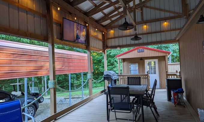 This amazing property boasts wonderful outdoor living complete with fire pit, covered patio, grill, and big screen TV. The three separate sleeping areas include a bunk house which sleeps 4, a separate house with queen bed, and the main quarters has a living area with a full kitchen, family room, bathroom, and queen size bedroom. Sitting a half mile from a private dock, boat ramp, and picnic area on Kentucky Lake makes this a jewel to treasure. This cottage welcomes lake lovers, families, hunters, fishermen, businesspersons, and anyone wanting to get away to the great outdoors. Also, no cleaning fee!
