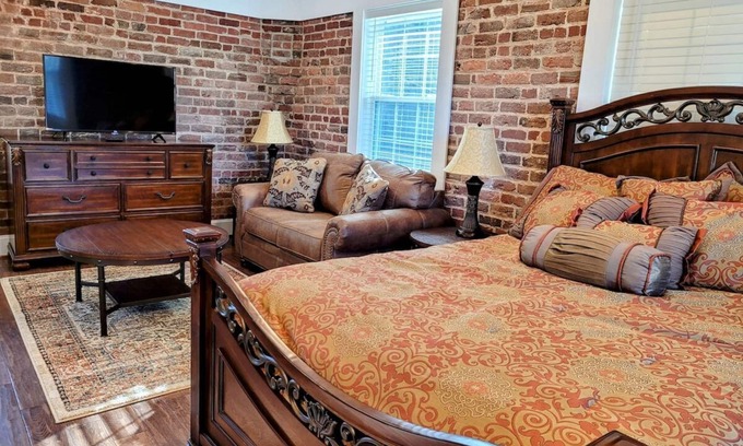The architectural features of The Carriage House create an atmosphere of rustic elegance that guests find absolutely captivating and irresistible. The stunning exposed brick walls serve as beautiful focal points throughout the space, telling the story of the building's historic past while creating warm, textured surfaces that add character and charm. These magnificent brick elements are perfectly complemented by the whitewashed cathedral ceiling, which adds dramatic height, abundant natural light, and a sense of grandeur that transforms the cozy studio into something truly spectacular.