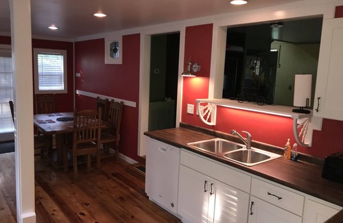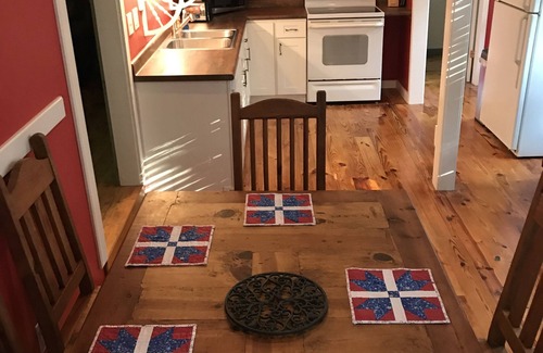 Interior features include hardwood floors throughout, a fully equipped country kitchen, dining area (seats 6), living area with reclining sofa & love seat, 52" HDTV, Wi-Fi Internet, and an assortment of books/games/movies. Hair dryers, iron, and ironing board are provided as are linens and towels....even utility towels for use with your pet in the event of rain!