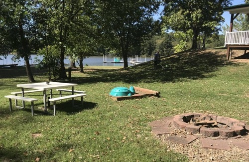 Main level has full furnished kitchen, sun porch with television and full size futon, living room has couch, two love seats and dining table for four that opens to a large partially covered deck with high top bar, four bar stools, table with four chairs and ceiling fan to cool you off after a day in the sun or on the lake. Televisions are connected to Direct TV. Master bedroom has queen bed and middle bedroom has full size bed with closet and dresser in both. Walk out lower level has king bed with washer/dryer and additional refrigerator. Yard area has fire pit and additional seating. Large playhouse for small children (adult supervision required at all times).
