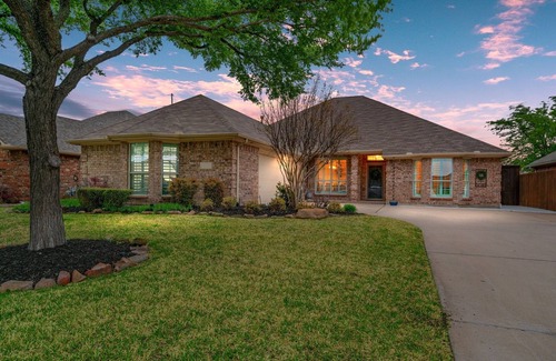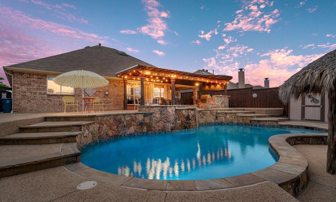 Great for family stays, beautiful home. Back yard has a unique heated pool / Spa with nice falls. Outdoor kitchen with a large dining table, seats 8. Sitting area under Mexican Palm cabana, and more sitting area. Inside, Large kids game room. TV in the master bedroom, living room, and game room. Two dining tables inside. Central location to everywhere, close To DFW airport.