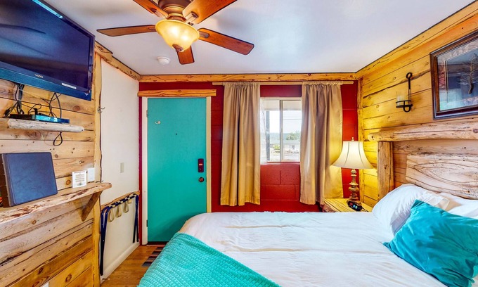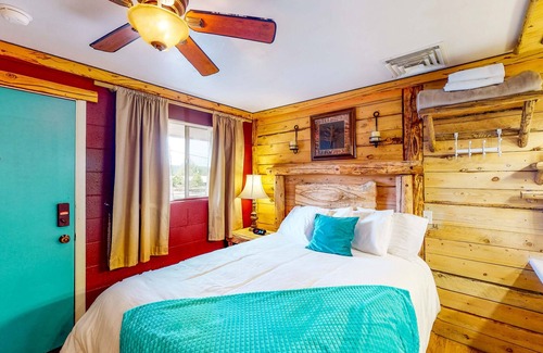 Utilize the kitchenette's fridge, microwave, and coffee maker to whip up tasty treats, and utilize the room's ample storage space to store all of your adventure garb. A handcrafted headboard, custom lighting, and a ceiling fan wrap up the cabin's stellar amenities.