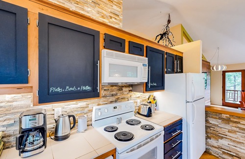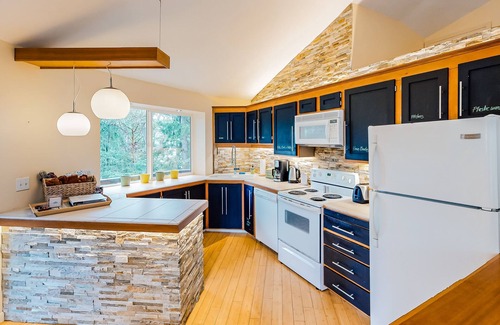 Inside, the house is modern yet cozy, with picture windows framing the forest at every turn. It's a lovely setting for playing board games by the window, watching movies on DVD and streaming services, and cooking at home in the well-equipped kitchen. Rounding out the home comforts are two serene bedrooms, central air conditioning, a private washer/dryer, and complimentary WiFi.