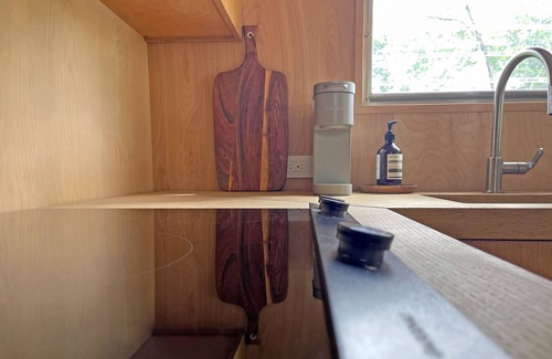 A picturesque floor-to-ceiling window invites the hours to melt away as it frames the majestic nature that unfolds before it. The 500-square foot backdrop beautifully swaddles custom-milled, select grade hardwood flooring, walls and ceilings. Speaking of ceilings, the camper’s do not require ducking. They are flat and tall (unlike its oft-confused counterpart—the Airstream’s) and dotted with recessed Lutron RadioRA lights for a perfect whole-home, dimmable illumination.