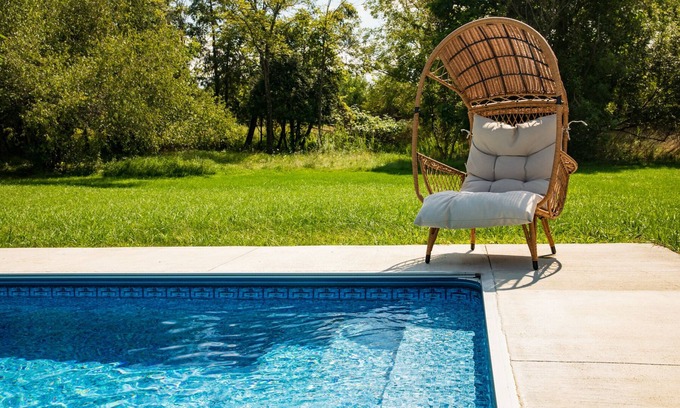 Seasonal, heated salt-water swimming pool. Open from mid-May through mid-October. The pool is gradually steeped toward a deeper end. It offers plentiful areas to lounge and let the day melt away. Sorry, pets are not welcome in the pool, but pooches can have their fun in the sun swimming in the gorgeous natural pond. Shared with homeowners and guests in the other camper on the property (should it be rented during your stay).