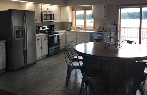 Outside is set-up for fully enjoying summer on the lake! There is a huge wraparound deck, gas grill, picnic tables, fire pit with grate for grilling, paddle boards, paddle boats, kayaks and many other “outdoor toys”. We have 3 docks on the west side of the island that are perfect for fishing, jumping off and relaxing on. Our swimming beach is weed- free and we have endless lakeshore to play on! The fishing right around the island is amazing, too! Want to have dinner out? We are just a short boat ride away from Charlie’s on Prior.