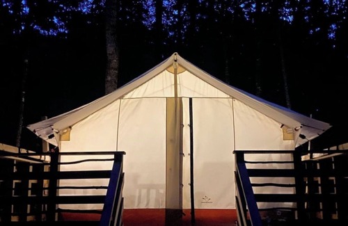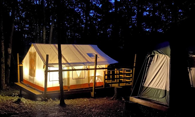Upon arrival, you will enjoy a spacious four-season canvas tent in a beautiful private setting surrounded by nature. The outdoor space includes an attached porch with comfy deck chairs, an adjacent firepit with a seating area, and a picnic table. The living area includes a queen bed, comfortable linens, extra blankets, nightstands, lanterns, towels, a kitchenette with a gravity sink, a 14-gallon cooler, and a dining table. A private outdoor hot shower and restroom are located next to the tent.