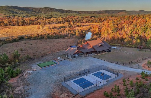 Enter and extraordinary outdoor paradise. Located just over 35 min. north of the tourist activities of Broken Bow/Beavers Bend & situated on 12 secluded acres, sits a one-story 3br/3b + bunk room cabin nestled upon the top of a ridge with a phenomenal million-dollar view of the mountains, valley and little river below. Never get bored with Pickle Ball, putting green, disc golf, basketball, volleyball, ping pong and much more.