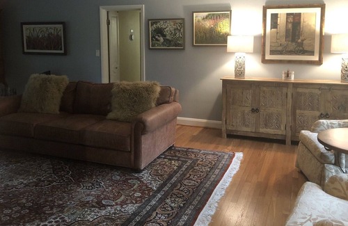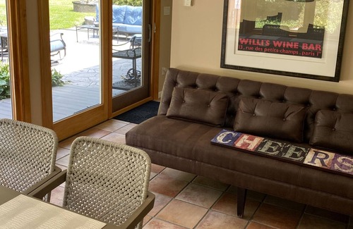 Lovely three-bedroom, 4 full bath stone rancher in quiet neighborhood. Private swimming pool, hot tub, outdoor shower, and tennis court. 1 acre of well manicured lawn. Plenty of outdoor lounging space with a ten person outdoor dining area and fire pit with seating. Spacious downstairs club room with ping-pong table and pool table and 72 inch flatscreen TV.