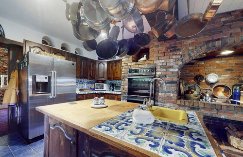 The floor-to-ceiling windows in the two living rooms as well as the large decks off the bedrooms allow for great wildlife watching around the two big ponds. The sunken living room will be right upon entering the home and is furnished with comfortable sofas, offering a great spot to unwind as soon as you arrive. Play some tunes on the provided turntable or stereo. The second and main living room oozes a homey feeling, and the brick wall adds a rustic touch to it. Guests will find a wood stove, smart TV, and board games. Right off of the living area is the elegant dining table providing enough space for up to six guests. The spacious and open kitchen is the most unique and quaint space you will ever see. A classic brick furnace hosts a stovetop along with several utensils. There is a double-door fridge, a built-in double oven, an electric oven, a dishwasher, a coffee maker, a microwave, and a center island with a sink. There is a nice corner booth table ideal for family breakfasts or quick meals on the go. Both spaces are warmed by a second wood stove.