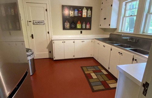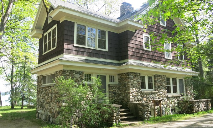 Wandawood Hall is a five bedroom, two and a half bath historic lake house. The first floor features a large living room with fireplace, fully equipped kitchen set up for large group cooking - triple sink and two refrigerators, large sunroom with lake view, small bedroom with 2 twin beds and a full bathroom. Second floor includes three bedrooms, one of which is very large with a queen bed and two twin beds and walk out balcony. There is another full bath on the second floor. the third floor is a large studio with 2 double beds, 2 twin beds (trundle style), and a half bath. Yard features beach/dock. Access to Wandawood Resort property and activities is included. Maximum 18 person occupancy. No smoking and no pets.
