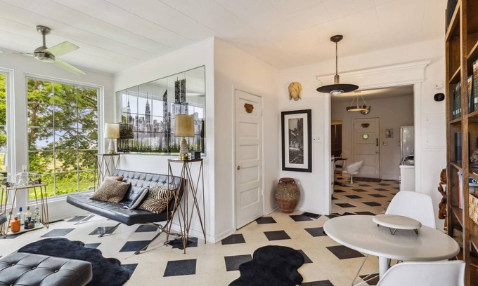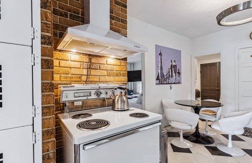 To the left, the guest bedroom features twin-size bunk beds and a convenient closet. The vintage-style kitchen is fully equipped with everything you need to prepare your favorite meals and includes seating for four. Just off the kitchen, the master bedroom offers a king-size bed, TV, desk for remote work, and a private half bath.