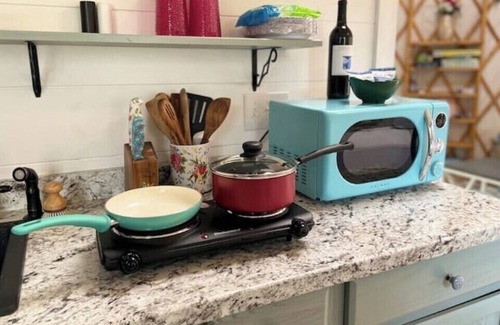Make meals in the fully-stocked kitchenette that has a 2 burner hot plate, air fryer that also has toaster & baking functions, crock pot, microwave, Keurig coffee maker, Fridge & Freezer. If you’re wanting to grill out, we’ve got you covered with a charcoal grill!