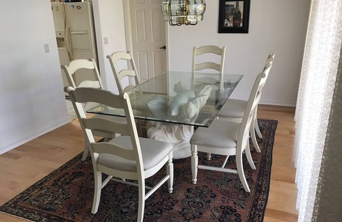 The Dining room is facing the front yard and you will sit on a Dolphin Table seating 6.