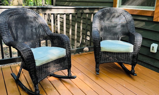 Relax on the porch in the rocking chairs, sipping your coffee and soaking in the total outdoor bliss. The bedroom and living room both have TVs, and the cabin is equipped with full Wi-Fi for your convenience. Outside, enjoy the tranquility of nature with a private fire pit, ideal for relaxing evenings under the stars.