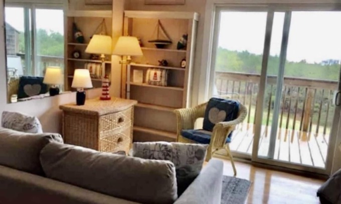 Bright, breezy second-floor studio apartment. Sleeps a maximum of 2 - if more than two people show up at check-in for the reservation, the reservation will be denied. Enjoy coffee, lunch, and dinner on the private deck with a view of Cape Cod Bay and the grassy backyard. Sleeps two on a queen-size bed. Comes complete with linens, a kitchenette, no oven, a cooktop, pots, pans, an apartment-sized refrigerator, a tub, Smart Streaming TV, and a pool. Complimentary Wi-Fi. Air conditioning and fresh towels are provided; please bring towels for the beach and pool. The Braemar Condominiums is a no-pets-allowed community. Guests are permitted 1 vehicle per unit. Additional vehicle is $10.00 per day.