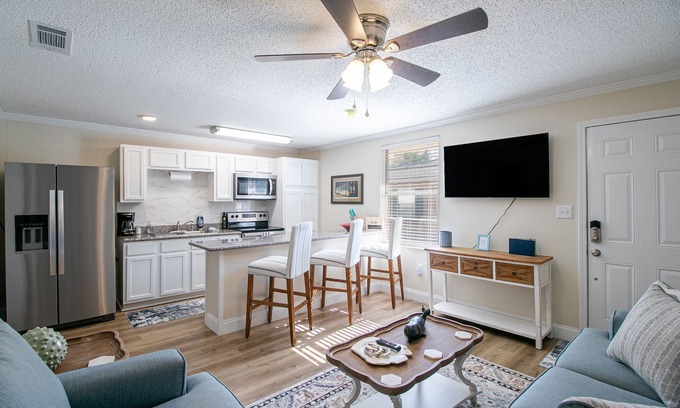 Enjoy a stylish experience at this centrally-located 1 Bedroom 1 Bath unit in Gulfport. Space can accommodate 4 guests with a king size bed and a queen air mattress. The living room is equipped with a Smart TV. Log in and stream with apps like Netflix and Hulu. The kitchen is fully equipped with all items needed for cooking. Awesome location with a short walk to the MS Aquarium, Jones Park and Downtown Gulfport.
