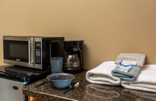 This is a nice one bedroom unit with a beautiful view. Unit included a fireplace and mini fridge and private garage parking. Kitchen and laundry are located in a commons area. Kitchen includes stove,fridge,microwave and dishes.
