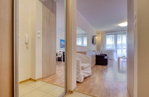 This modern apartment is near the sandy beach and spa park in a quiet area of Swinoujscie. All interesting place, promenade and restaurants are a few minutes walk away. The apartment itself has fast free WiFi, 2 sofa beds that can be used for maximum 4 adults, a kitchen with hotplates and a refrigerator, a TV with local channels and a balcony facing to the garden. A seperate own bathroom with shower, toilet and washing machine. There are parking spaces for bicycles and vehicles within the facility.