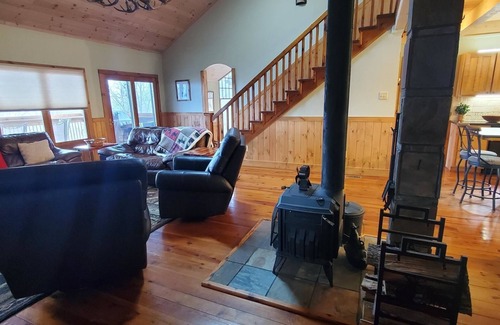 This private mountain getaway features vaulted ceilings and open concept main area including living room with HDTV, authentic wood stove, and comfy leather seating. The well-equipped kitchen features granite countertops and a bar with seating for two. The dining room offers seating for eight, a second wet bar with seating for four and a wine cooler. Step outside the main living area to a large, covered deck with a cozy porch swing, outdoor dining, gas grill, outdoor shades and fan to ensure your enjoyment of this space in comfort.