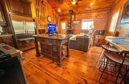 The main floor features tile flooring, with 10-foot ceilings that enhance the spacious feel of the living areas. A wood-burning stove, set on a large stone slab, provides both ambiance and backup heat for those chilly mountain nights. The stained pine trim adds a cozy finishing touch to the interior. There is a large flatscreen TV with streaming channels for curling up and watching a good movie on those cool evenings.