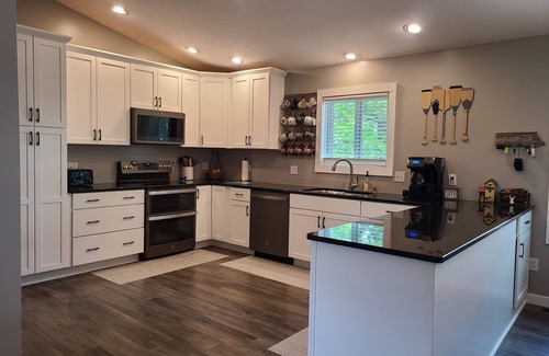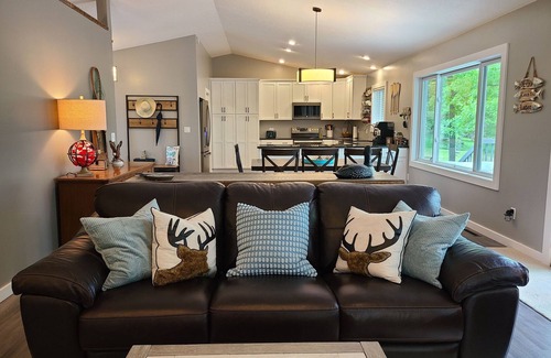 The fully equipped kitchen is a chef's delight with plenty of space to entertain. With five comfortable bedrooms and 3 bathrooms this lake cabin can accommodate many guests, making it ideal for families, groups of friends, or even a couples' retreat. The lower-level features a cozy sectional couch, bar, arcade games, foosball, and an endless supply of board games and puzzles providing hours of fun.