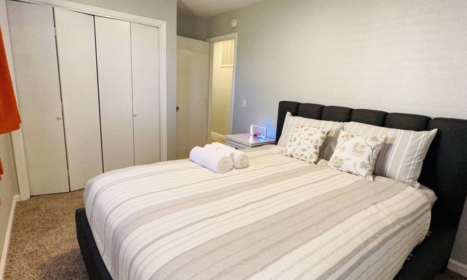 Updated 2/2 Updated King Queen Beds. The Primary King bed has an electric base that elevates the bed for easy viewing of the 42" inch Tv and has a great ensuite. The living space has cathedral ceilings a gas fireplace, a 55" inch smart TV with 120 channels on You Tube TV. White quartz counters, grey laminate floors, and all new appliances make this update complete. This East Central location has easy access from the Austin airport. Quick access to 183 & 290 allows you travel Downtown,