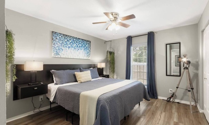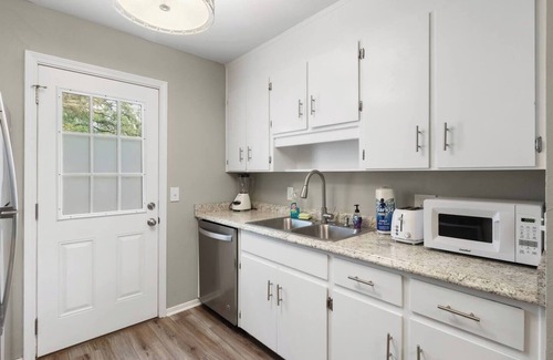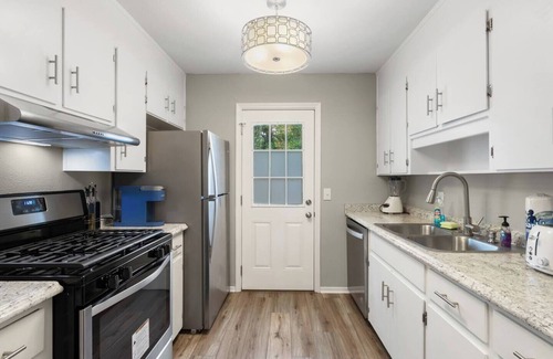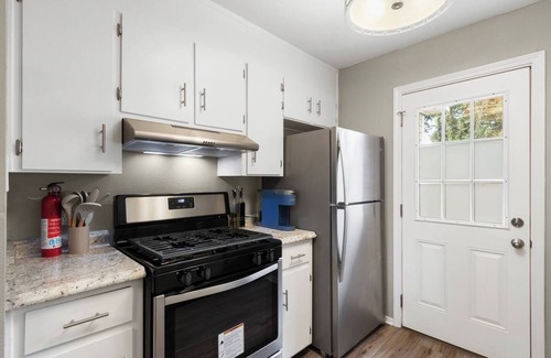 Spacious 2 bedroom townhouse completely remodeled with all the amenities. Fast Wi-Fi, smart TVs in living room and both bedrooms. Fully furnished kitchen with gas stove, stainless appliances, and granite counters. Vinyl plank floors, neutral colors and all new furnishings throughout. Furnishings include a king bed, queen bed, a large sectional, and a dining table that easily sits 6. Pet and child friendly with a private fenced back space (10x20). Laundry located in utility room off back patio.
