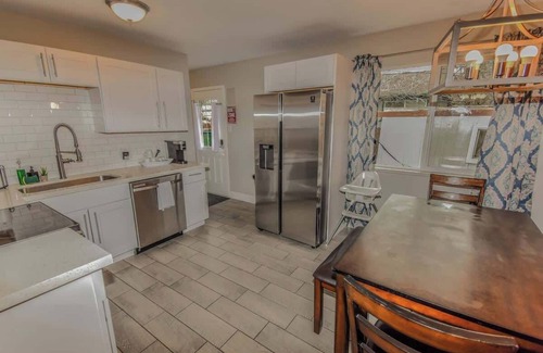 This remodeled ranch home boasts a bright, open layout with smooth floors and modern updates. Three spacious bedrooms with king beds, plus extra sleeping options, accommodate up to 8 guests. The sleek kitchen is stocked with essentials, while smart TVs offer entertainment. Relax in the backyard with hammocks and enjoy central air and heat. A smart lock ensures secure, easy access via private entrance.