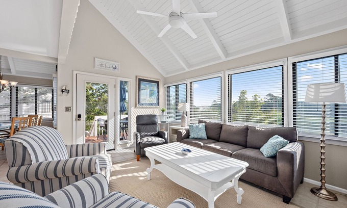 Make yourself at home in the comfortable family room with soaring ceilings and plenty of seating for everyone, You will be greeted with a spectacular wall of windows in the living area that frame the natural beauty of Seabrook. Enjoy watching the television after a long, hot day or stream your favorites with the free WiFi included. The fully equipped, tastefully updated kitchen enables everyone to enjoy meals together. There is even a small coffee bar area with a prep sink. The dining table is framed by windows and is also great for board games/cards after a busy day of fun in the sun.