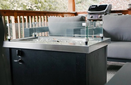 The furniture throughout this home is modern and updated. Comfortable, high-end beds throughout, to help you relax and enjoy your vacation or PNW getaway! Perfect for a large group, equipped with several amenities to make your stay more comfortable when traveling with your whole group. The back patio is completely covered, with a view of Mt. Hood, a gas fire table to keep you warm and tons of seating for everyone to hang out. This space is very large and comfortable with a grill, to show off your culinary skills! This outside undercover space allows for the whole group to enjoy the fresh air and each other's company. Cozy touches, thoughtful design, and easy, fun, location make this a perfect home base for your stay in the PNW. Whether you are here for the hiking and ample outdoor activities or hosting or visiting family, you will find your relaxation here!