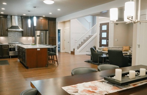 Enjoy a comfortable and convenient stay at this clean and comfortable New Construction Home! Complete with multiple separate areas perfect for lounging or using as workspaces. Relax with your group in the Den, with the flat screen and daybed! Gather in front of the gas fireplace or in the spacious and well-equipped kitchen, with all your basic cooking needs, so you can enjoy cooking in!