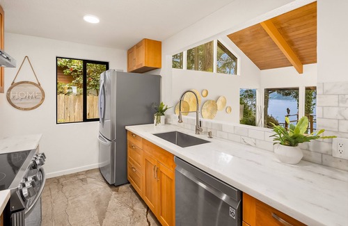 Updated beachfront home with private beach, water views, spacious deck, & W/D | House in Bainbridge Island