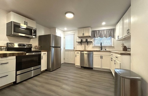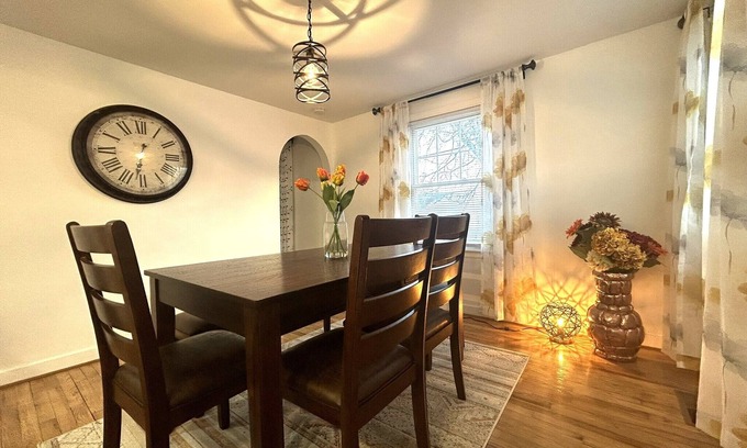 Sleep 6 in family friendly, bright, spacious, cozy Cape with hardwood floors. 1st floor bedroom and bathroom. Bedrooms are roomy with sitting areas and comfortable beds for a good nights rest in a quiet and safe neighborhood. Open kitchen with butcher block breakfast bar; family dining in open dining room that seats 6. Living room with leather furniture, 60" TV and room for game night. Work station with hi-speed internet; fenced in yard, patio, and grill. Garage and driveway park 3 cars.