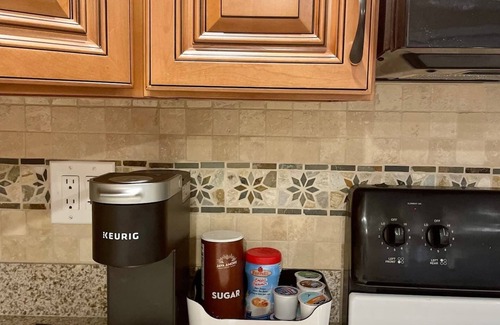 The kitchen includes a full-size fridge, Keurig (coffee pods, hot chocolate pods, creamer and sugar included), oven and range, microwave, toaster, variety of pots, pans, dishes, utensils, dish towels, cleaning and cooking supplies available.
