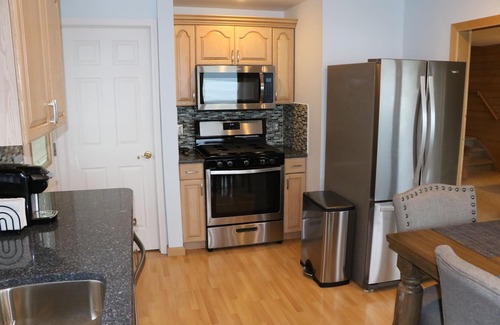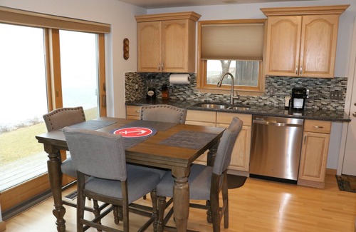 Enjoy the amenities of home with this recently updated lakefront chalet with private lakefront and beach. Offering comfortable sleeping for 8, this year-round vacation dream comes with 4 bedrooms, 1 1/2 baths, 2 car attached garage, central air, full kitchen (including Cambria quartz countertops, stainless steel appliances, Keurig), dishwasher, washer/dryer, gas fireplace, propane gas grill, flat screen TVs with HD cable and DVD players in the living room and master bedroom. HD cable including regional sports channels (including ESPN & BTN) and HBO in living room and master bedroom as well as wireless internet are included. Linens, towels, and some basic essentials are included to make your stay as easy as possible.